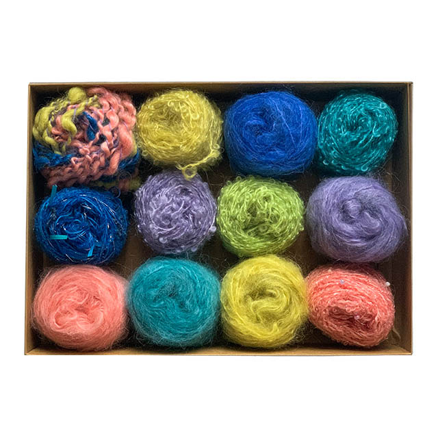 Each box is handmade and will therefore contain variations in bead colour and ribbon yarn. The chunky spun yarn is a handspun upcycled yarn and will be different every time. This is done so that every item knitted is a unique creation.